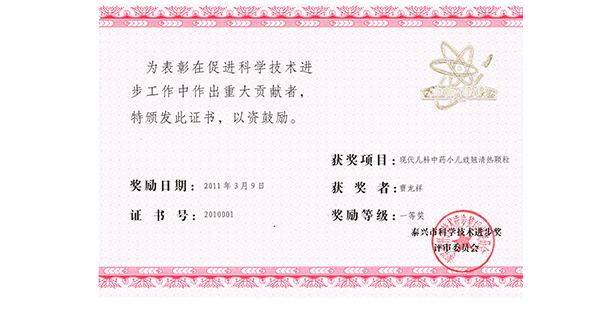 • 泰兴市科技进步奖-小儿豉翘清热颗粒