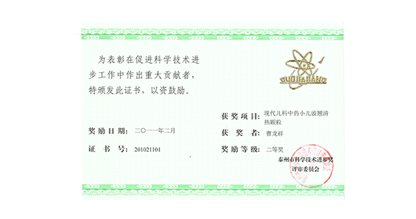 • 泰州市科技进步奖-小儿豉翘清热颗粒.